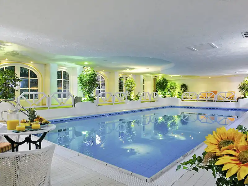 Wellnessbereich mit Hallenbad mit Gegenstromanlage, Erholungsbecken, Whirlpool, Finnischer Sauna, Dampfbad und Aromabad